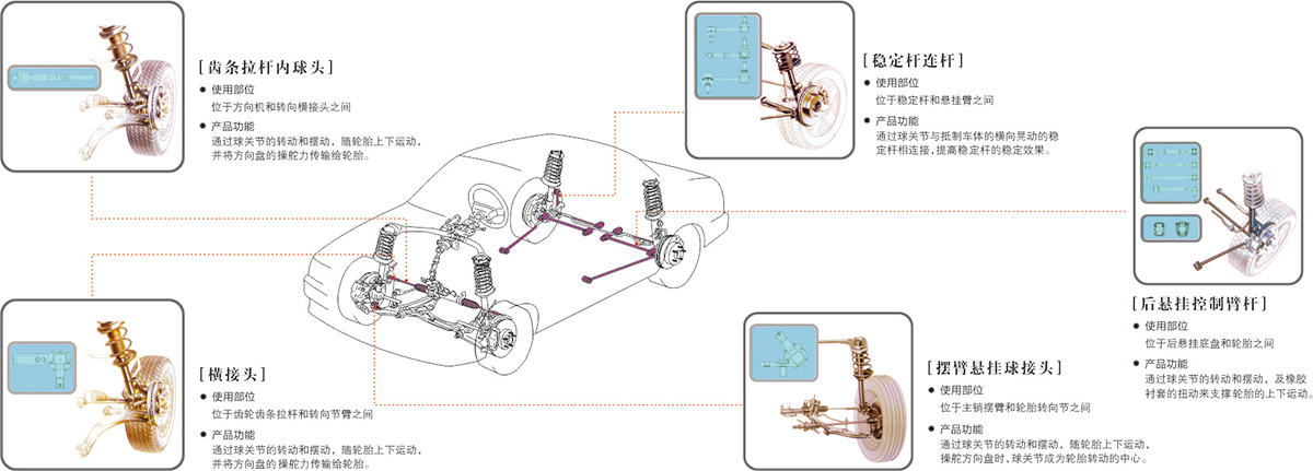 懸架擺臂及球頭 后懸架控制連桿總成 穩(wěn)定桿連桿總成 轉(zhuǎn)向拉桿總成 輪邊離合器總成 其他